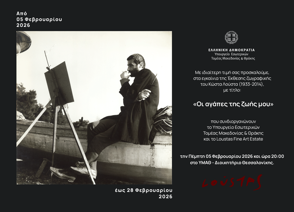 «Οι αγάπες της ζωής μου» είναι ο τίτλος της Έκθεσης Ζωγραφικής έργων του Κώστα Λούστα (1993-2014), που θα εγκαινιαστεί μεθαύριο Πέμπτη, 5 Φεβρουαρίου 2026 και ώρα 8 μ.μ. στο Διοικητήριο (Υπουργείο Εσωτερικών-Τομέας Μακεδονίας-Θράκης).