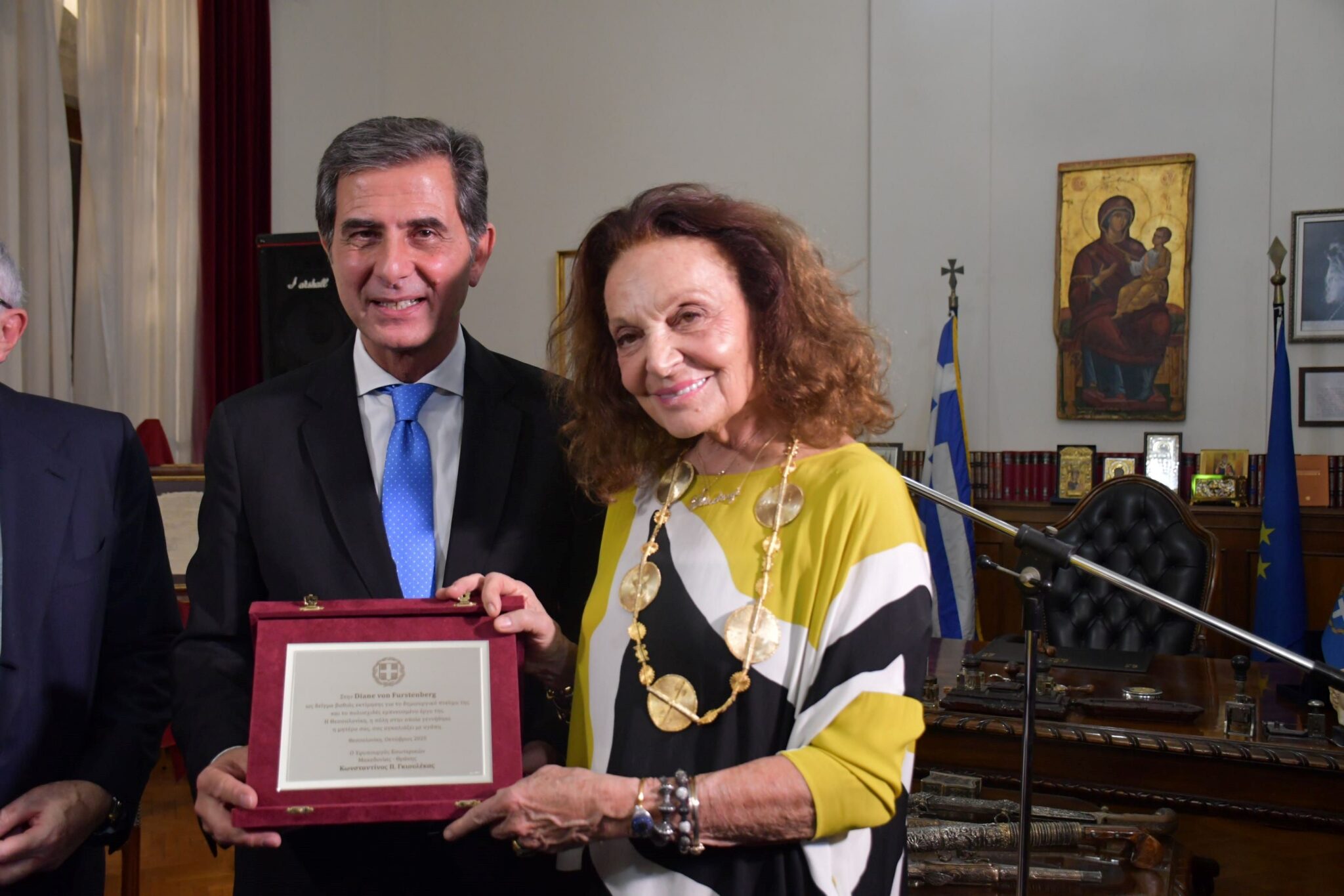 Η Diane von Fürstenberg, η οποία αντλεί την καταγωγή της από τη Θεσσαλονίκη, βραβεύτηκε για το εξαιρετικό φιλανθρωπικό της έργο και την προσφορά της στην ενδυνάμωση των γυναικών από τον Υπουργό Εσωτερικών-Μακεδονίας και Θράκης, Κωνσταντίνο Π. Γκιουλέκα, χθες το απόγευμα στο Διοικητήριο.